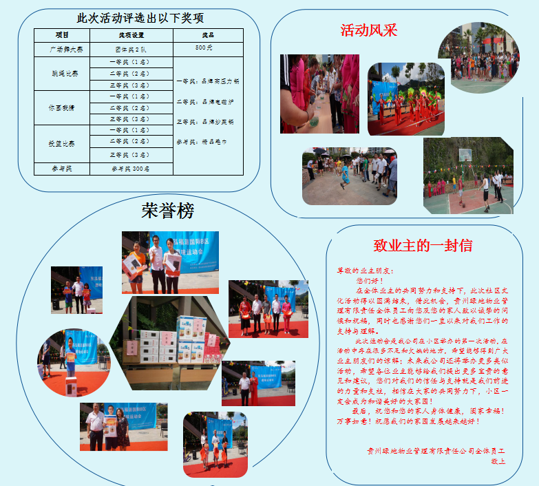 2017年7月22日(星期六)小区首次“趣味运动会”圆满结束,此次活动以“团结、文明、和谐”为主题,以趣味运动的形式开展,旨在营造一个快乐、和谐、欢心的大家庭氛围,拉近业主之间的距离。本次活动的顺利开展离不开各位业主们对此次活动的支持与积极参与。